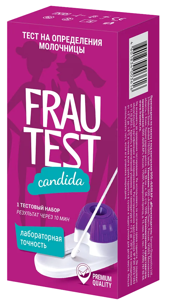 FRAUTEST candida – Современная диагностическая тест-система. Принцип действия основан на иммунохроматографическом методе качественного выявления дрожжеподобных грибов рода Candida в цервикальном секрете влагалища в домашних условиях. Точность метода составляет 95%.