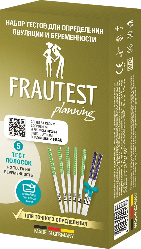 FRAUTEST Planning — Тест представляет собой пропитанную реагентом (мечеными антителами к ЛГ) бумажную полоску, которую на 10 секунд погружают в емкость с мочой.